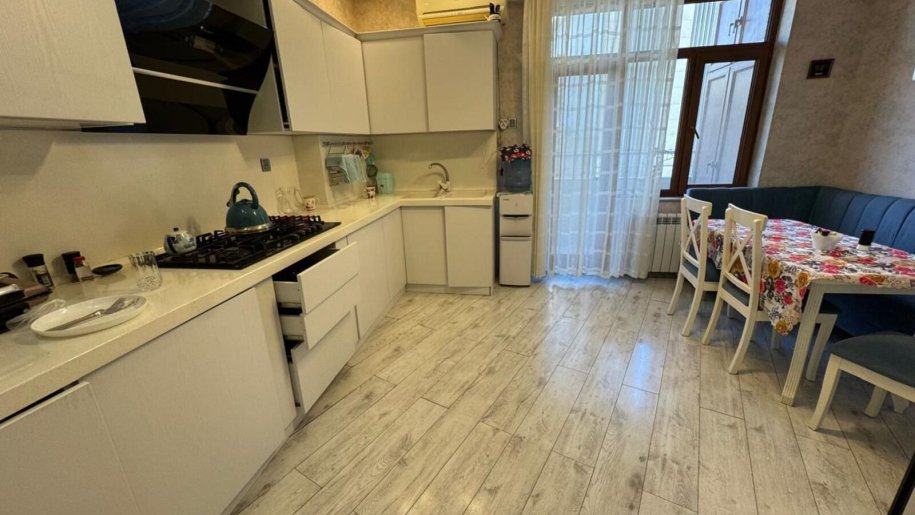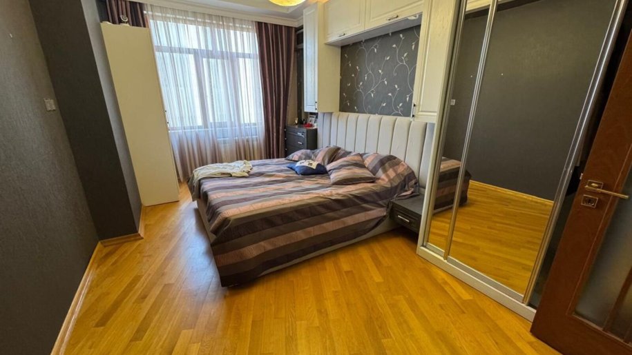 Mənzil işıqlı, gözəl, YELÇƏKƏN, qanuni 3 otaqdan 4 otağa düzəldilmiş (42kvm-lik zal, böyük valideyin yataq otağı və 2 uşaq otağı), 1 böyük sanitar qovşağı, böyük mətbəxi, 2 balkonu (1 balkon otağa qatılıb, 2-ci balkon açıq-mətbəxdən çıxışı var) və böyük dəhlizi. Mətbəx isti döşəmədir. Təmirdə bahalı və keyfiyyətli materiallarla təmir olunub, Bahalı əşyalar və elektrotexnikalar (hər otaqda bahalı kondensionerlər, paltaryuyan, qabyuyan maşınlar və s) qiymətə daxildir. Çıxarışda 121kvm-dir.